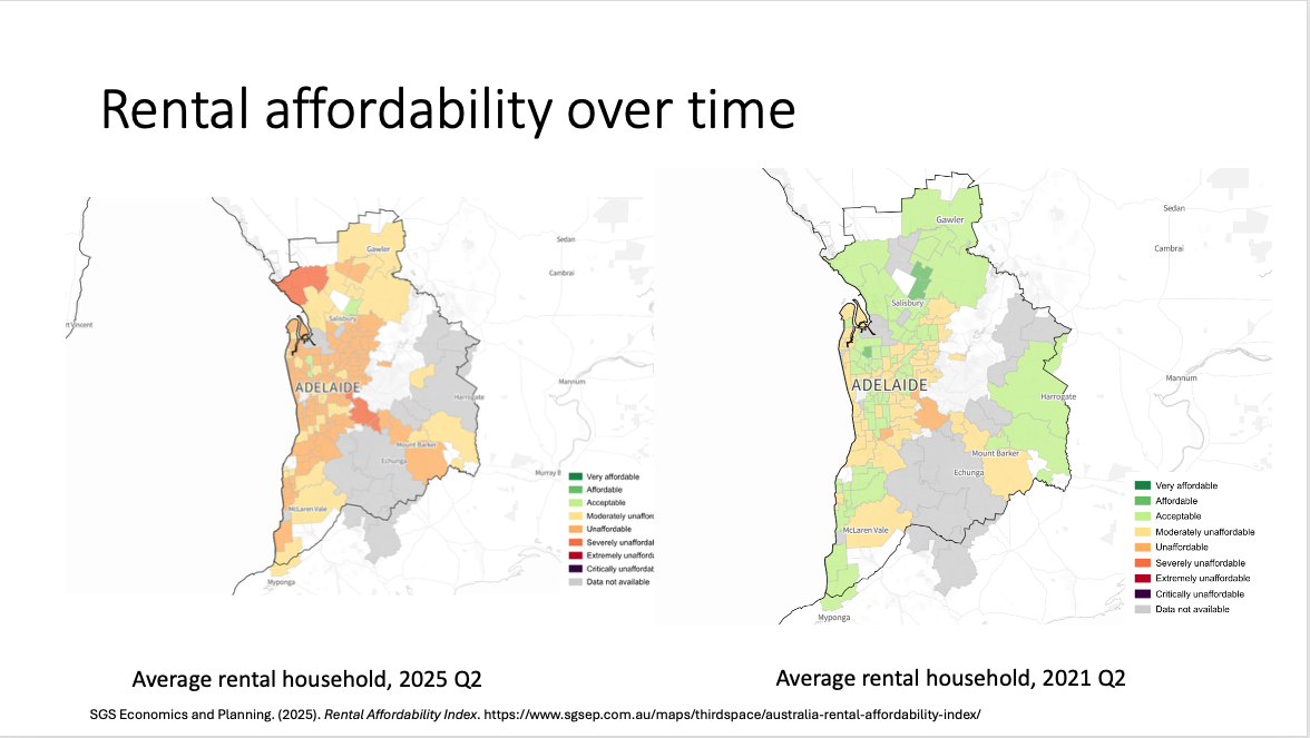 Researcher Dr Kate Raynor, head of think tank Per Capita’s Centre for Equitable Housing, showed two graphics of South Australia – only a few years apart – showing that affordable rentals have all but disappeared.